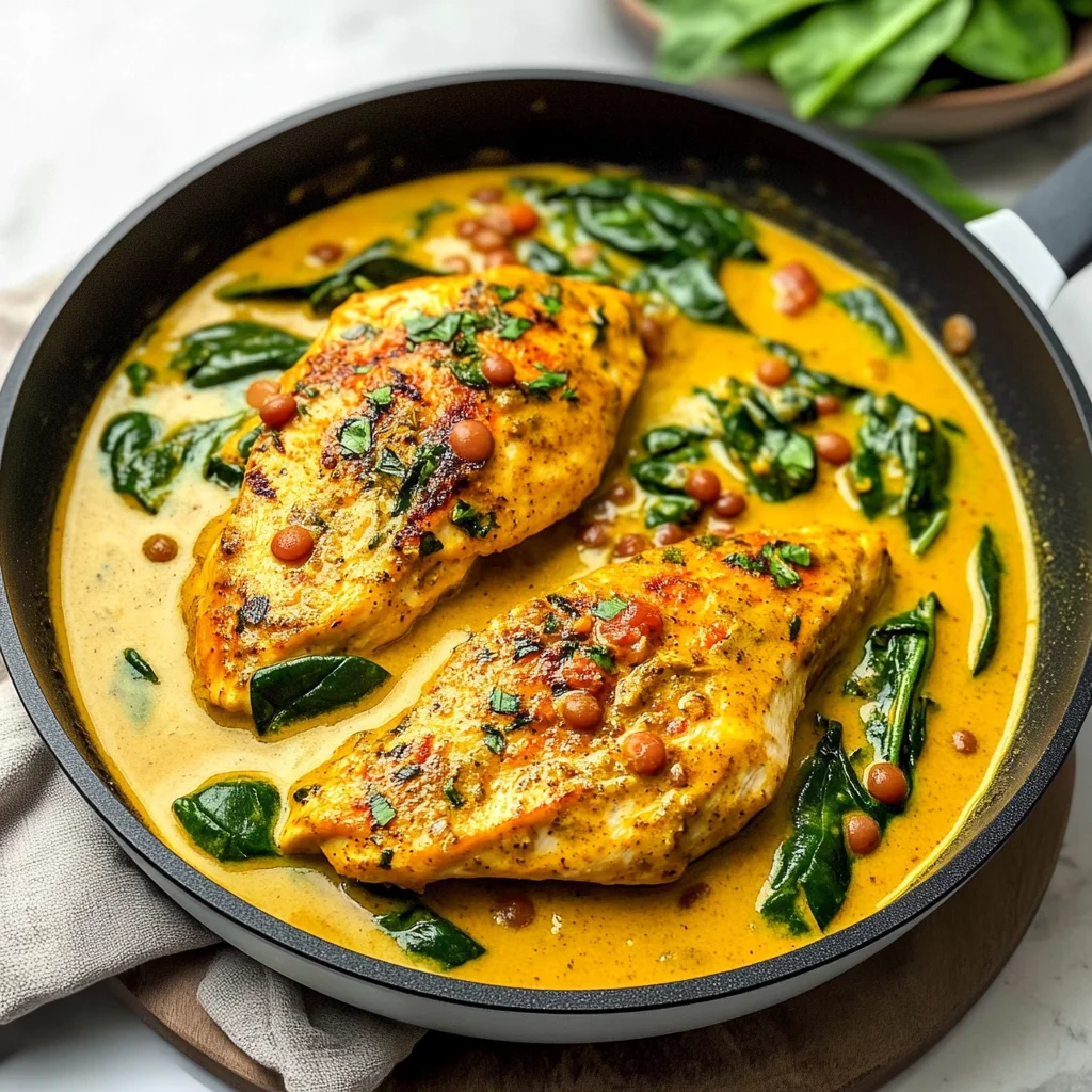 I love prepping the Coconut Turmeric Chicken Skillet With Spinach & Lentils ahead of time. You can chop your veggies and even cook the chicken the day before, storing everything in airtight containers in the fridge. I usually keep the cooked chicken for about 2-3 days without any issues. Just remember to add the fresh spinach right before serving so it stays vibrant and crisp-tender. The lentils and coconut milk sauce hold up really well, but I wouldn’t recommend reheating leftover spinach; it tends to get mushy (not cute). So, take your time and enjoy this dish when you’re ready! Trust me on this one.