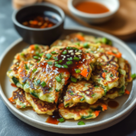 Veggie pancakes with Asian dipping sauce are a delicious and healthy dish made from finely chopped vegetables mixed into a batter and pan-fried until golden. This dish is often served with a flavorful dipping sauce that includes ingredients like soy sauce, sesame oil, and rice vinegar. They make for a perfect appetizer or light meal, combining various textures and flavors to delight your taste buds.