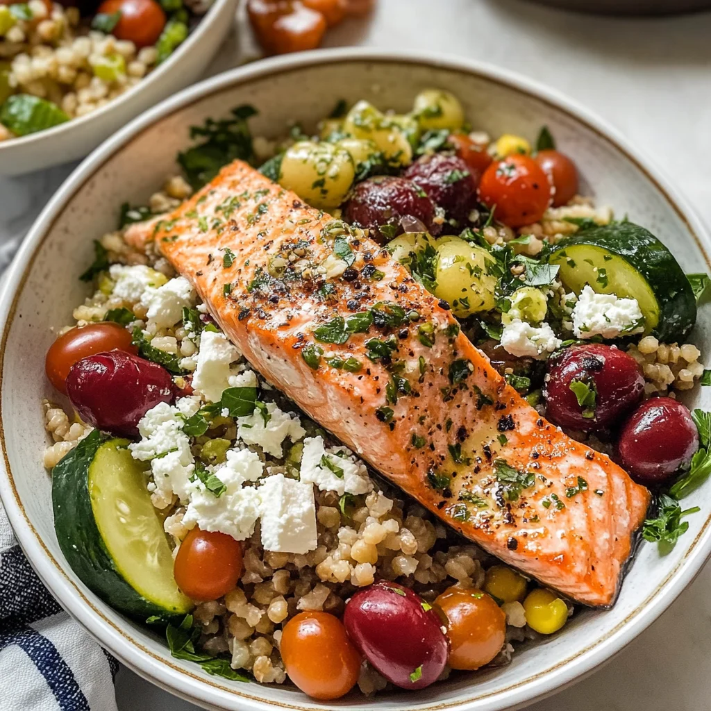 These Greek Salmon Grain Bowls are all about that flavor payoff. The combination of fresh lemon juice, high-quality olive oil, and the right seasonings really brings everything to life. If you’ve been putting this off, tonight’s the night. You’ll love how filling they are without feeling heavy. Plus, they come together in no time! Let me know how yours turned out in the comments — I can’t wait to hear what toppings you tried!