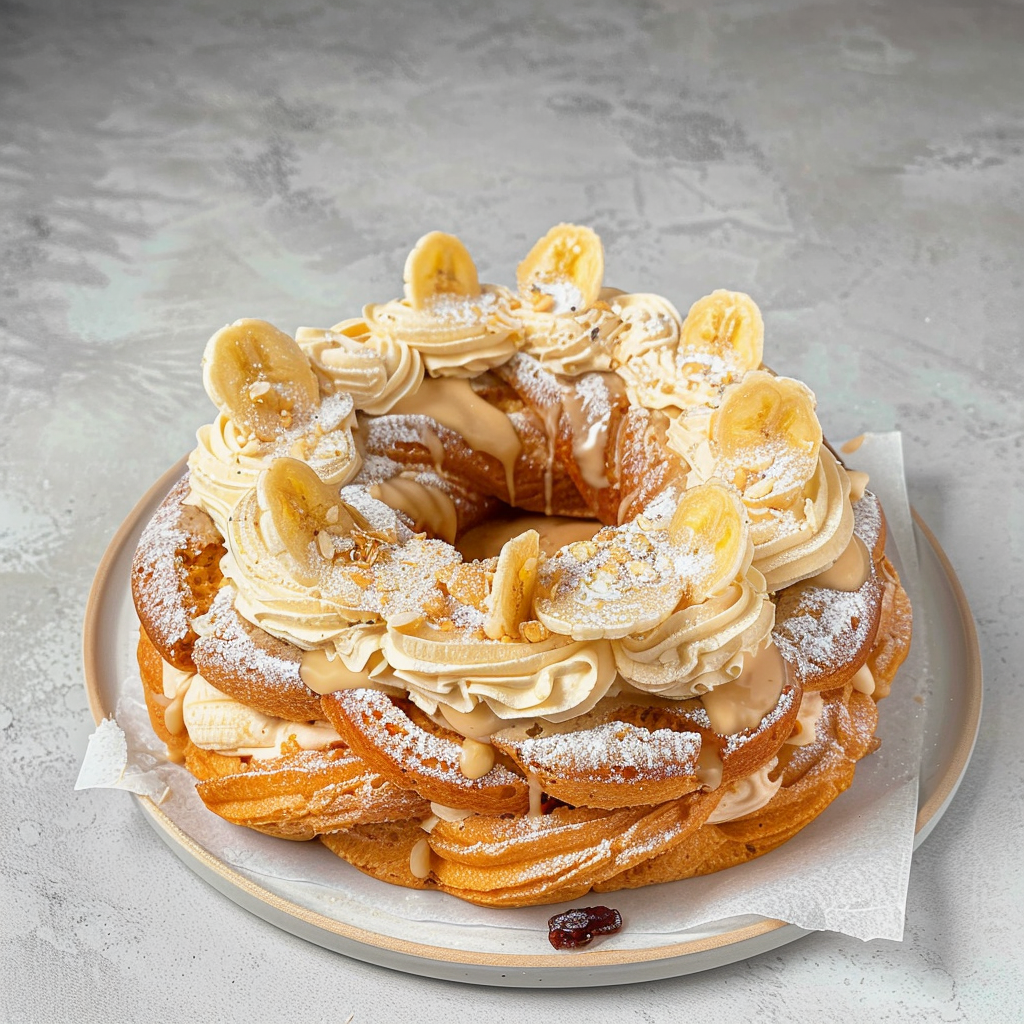 Banana Pudding Paris-Brest is a delightful dessert that combines the classic French pastry, Paris-Brest, with the creamy, rich flavors of banana pudding. The pastry itself is made from choux dough, which puffs up beautifully when baked. Once cooled, it is filled with a luscious banana pudding mixture, often topped with whipped cream and fresh banana slices. This unique twist on the traditional Paris-Brest offers a perfect balance of textures and flavors.