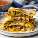 Cheeseburger Quesadillas are a delightful fusion of classic cheeseburgers and cheesy quesadillas. They feature seasoned ground beef, gooey cheese, and optional toppings like onions or peppers, all sandwiched between two crispy tortillas. Perfect as an appetizer or main dish!