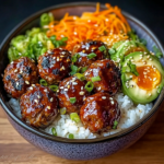Korean BBQ Meatball Rice Bowls are a delicious fusion dish featuring tender meatballs made with ground meat, typically beef or pork, seasoned with traditional Korean spices. These meatballs are served over a bed of steamed rice and topped with various fresh vegetables, like cucumber and scallions, as well as a savory sauce. This bowl not only offers great flavor but also brings a balance of textures, making it a popular choice for both lunch and dinner.