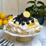 A Lemon Blueberry Pavlova is a delicate dessert made from meringue topped with whipped cream and fresh blueberries, all infused with zesty lemon flavor. It’s light and airy yet rich in taste.
