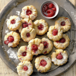 - Press your thumb gently into each ball to create a well, then fill each with raspberry preserves.