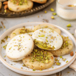 Dip & Decorate: Dip half of each cookie into melted white chocolate then place them back on parchment paper to set. Sprinkle additional crushed pistachios on top while still wet for extra flair.