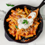 To store leftover Spicy Vodka Rigatoni with Burrata, keep it in an airtight container in the fridge for up to three days. When reheating, add a splash of cream or water to ensure it doesn’t dry out, and warm it gently on the stove over low heat while stirring occasionally.