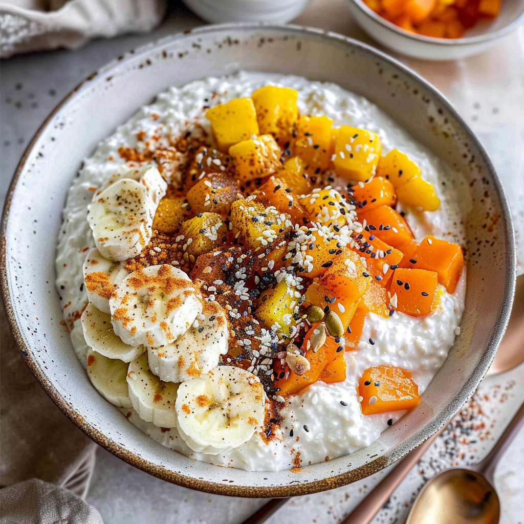 A Mango Tajín Cottage Cheese Bowl is a delightful combination of creamy cottage cheese topped with fresh mango chunks and a sprinkle of Tajín seasoning. This dish balances sweet and savory flavors perfectly, making it a refreshing snack or light meal.