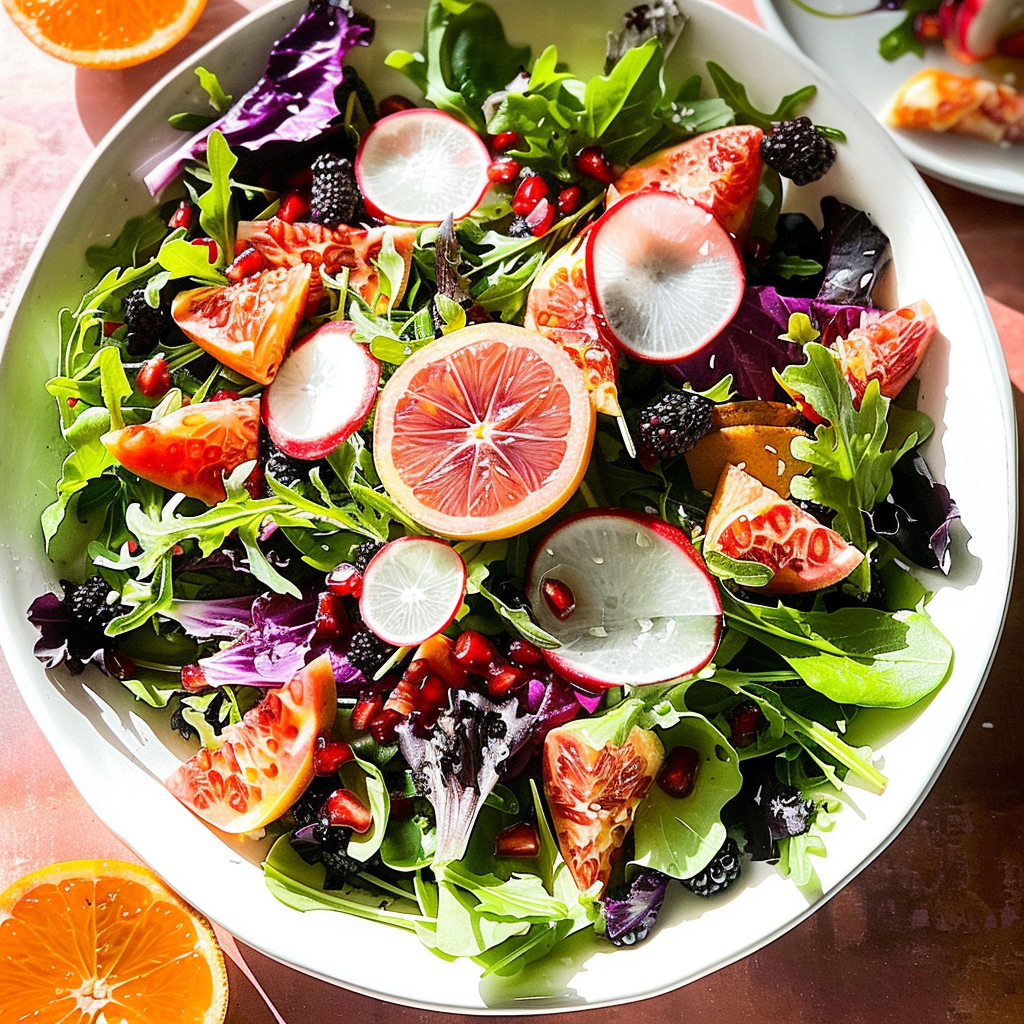 The key ingredients include fresh greens like spinach or arugula, juicy pomegranate seeds, citrus like oranges or grapefruits, nuts such as walnuts or pecans, and a tangy citrus vinaigrette made from olive oil, lemon juice, and honey. This combination creates a delightful medley of flavors that dance on your taste buds.
